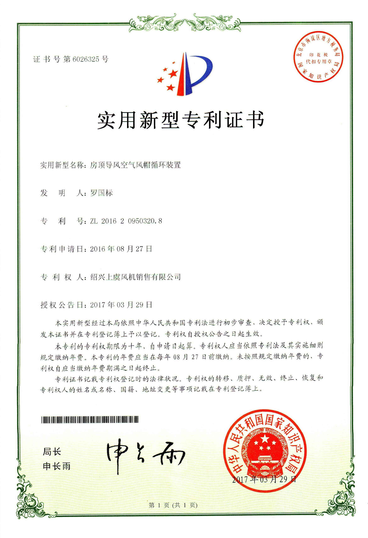 房頂導(dǎo)風(fēng)空氣風(fēng)帽循環(huán)裝置專利證書 |